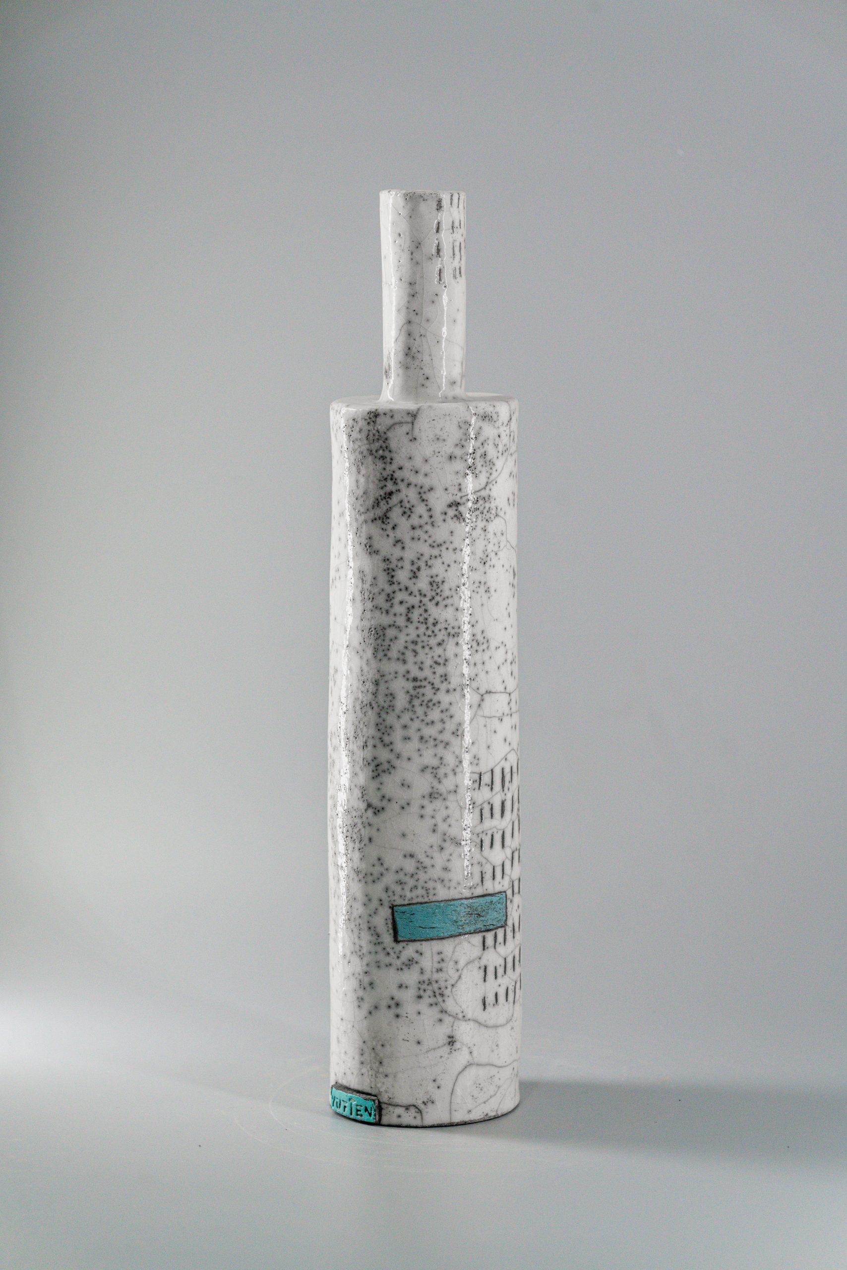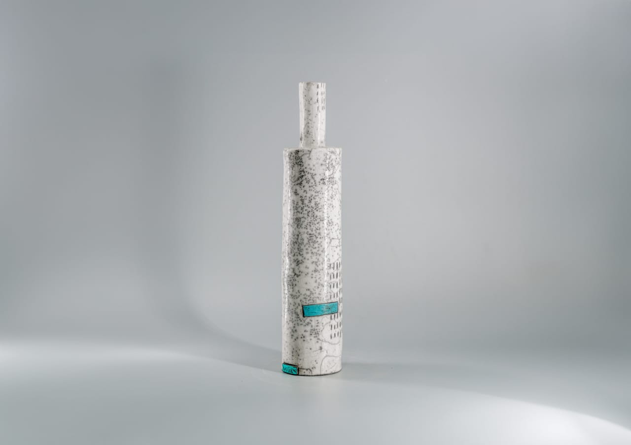 Handmade vase, in the shape of a bottle, is distinguished by a harmonious geometric composition enhanced with a touch of turquoise color. This vibrant note instills visual depth and subtle freshness, giving the object a contemporary elegance that fits perfectly into any type of interior, dimension H 50 cm x D 12 cm.