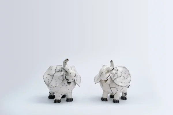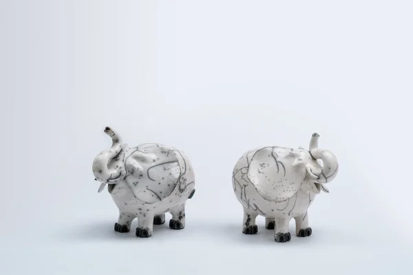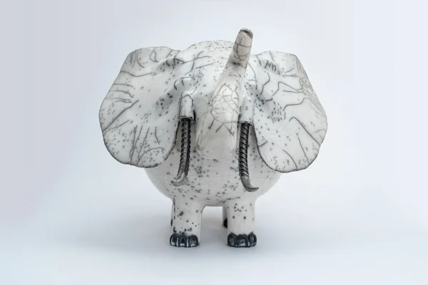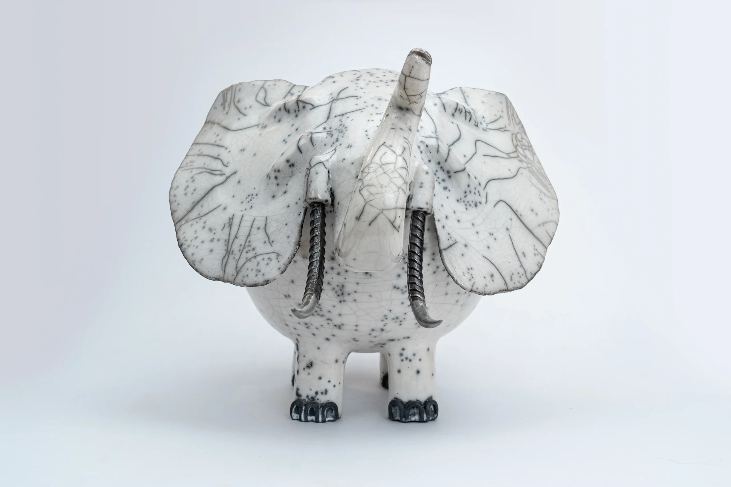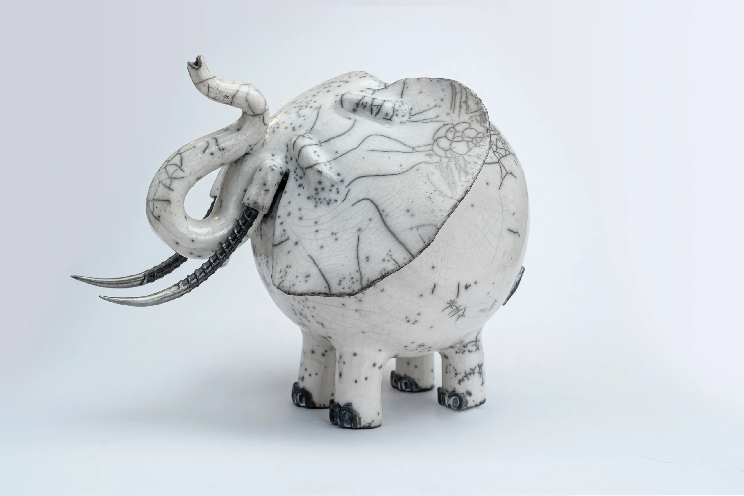 Éléphant avec défenses en métal, sculpture minimaliste en céramique Raku et métal brut, dimension H 30 cm x L 28 cm x P 30 cm.
