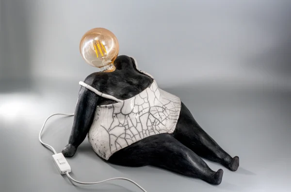 sculpture en céramique, technique Raku, aux formes généreuses et élégantes, apportent une touche de sophistication à tout intérieur moderne. Leur design unique, alliant sensualité et lumière douce, crée une ambiance chaleureuse et raffinée, idéale pour sublimer. Dimension femme luminaire assise H 28 cm x L 20 cm x P 39 cm.