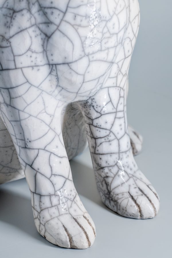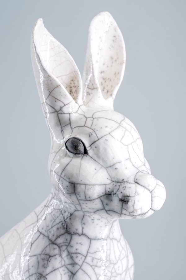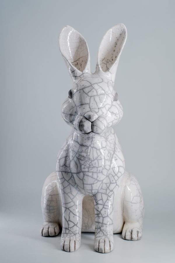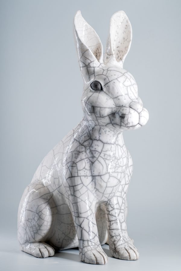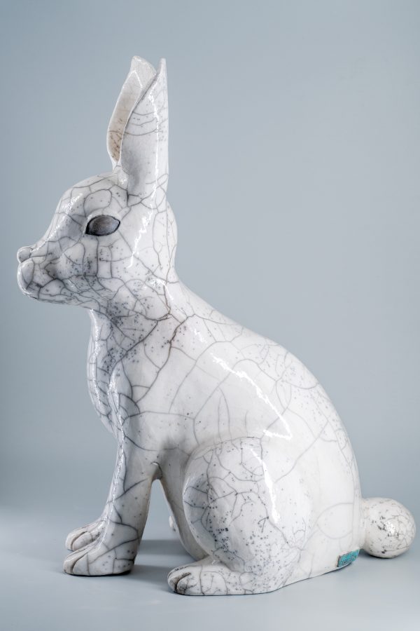 Lapin sculpté à la main, avec ses courbes généreuses, évoque la douceur et la magie de l’enfance. Il rappelle des histoires intemporelles comme la fable du lapin et de  la tortue ou les aventures d’Alice au pays des merveilles, insufflant une touche de nostalgie et de poésie dans un coin de l’intérieur, dimension H 47 cm x L 28 cm x P 42 cm.