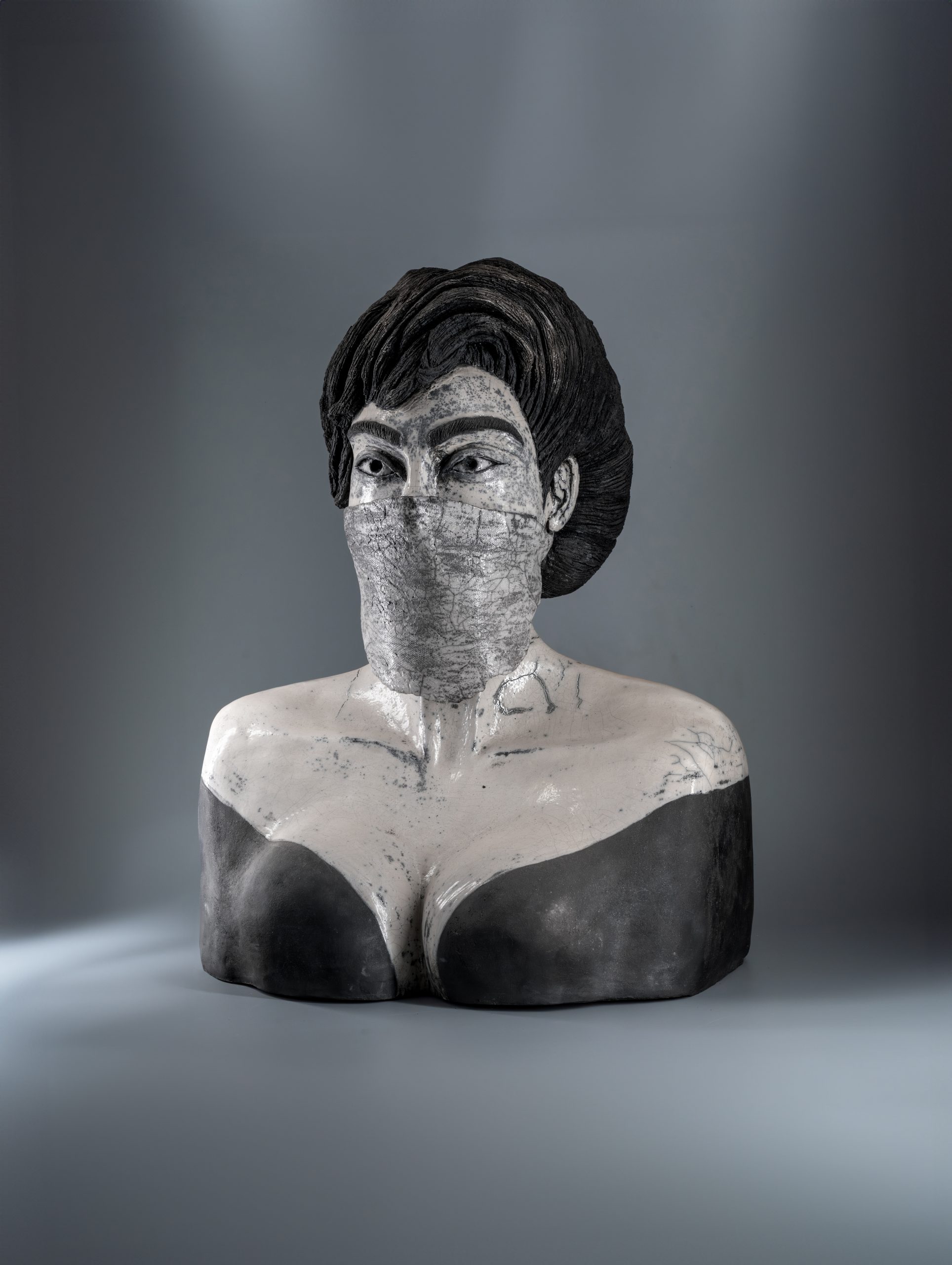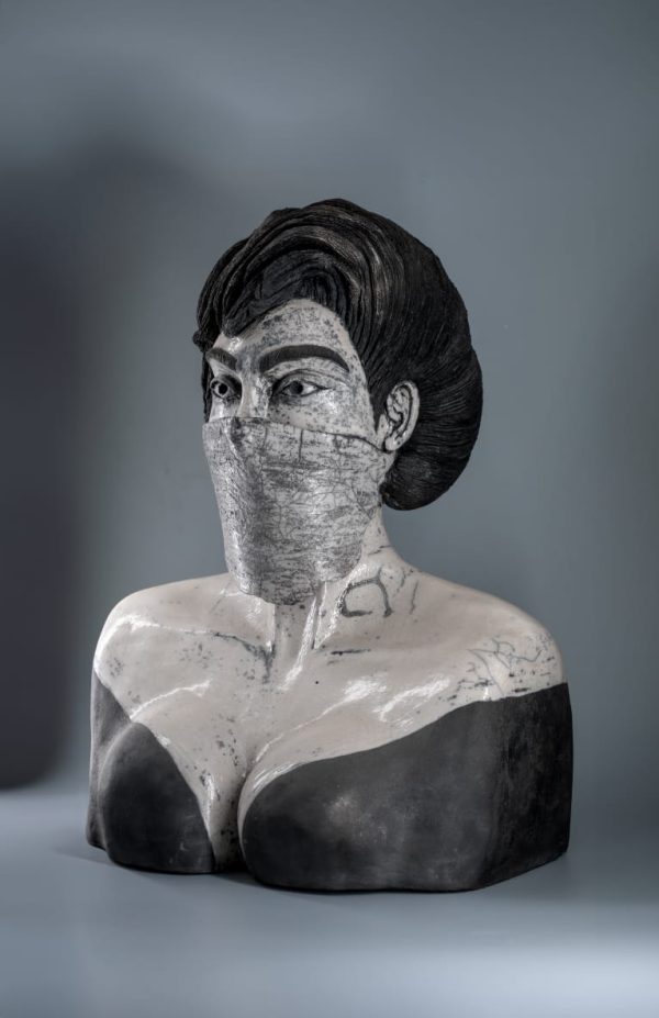 Sculpture en céramique Raku représente un buste d’une femme portant l’Asaba , une tenue traditionnelle tunisienne drapée élégamment