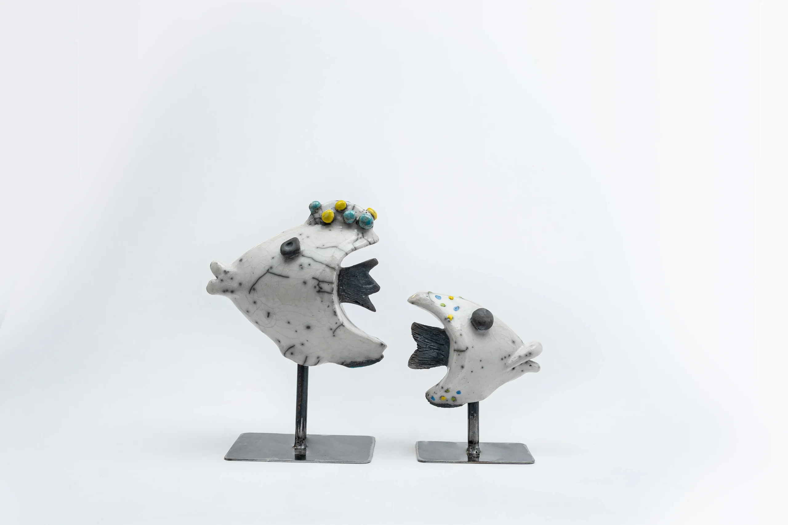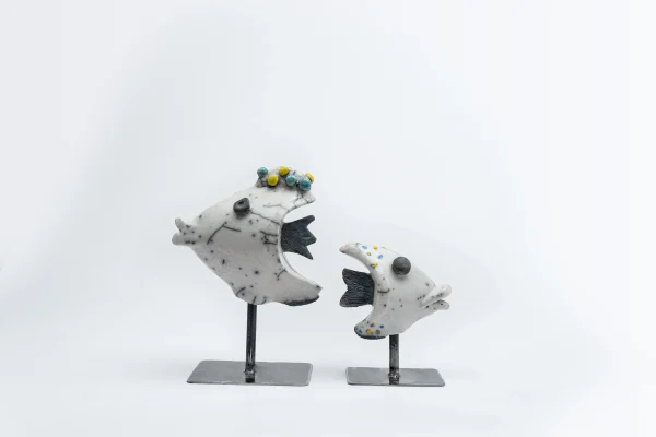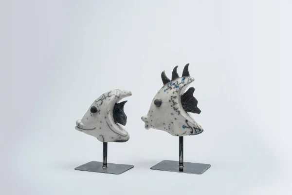 Poisson en céramique, technique Raku, posé sur un socle en métal noir, arbore des détails raffinés en relief ou incrustés dans sa surface, rappelant les textures naturelles des fonds marins. Ses couleurs chatoyantes, inspirées des nuances éclatantes de la mer, insufflent une ambiance de fraîcheur et de sérénité à votre intérieur, dimension H 10 cm x L 4 cm x P 7 cm.