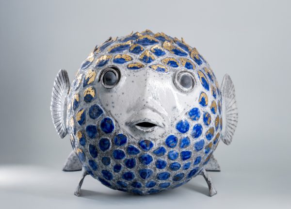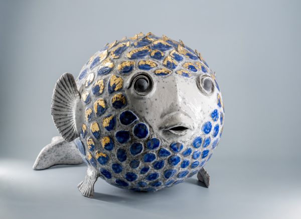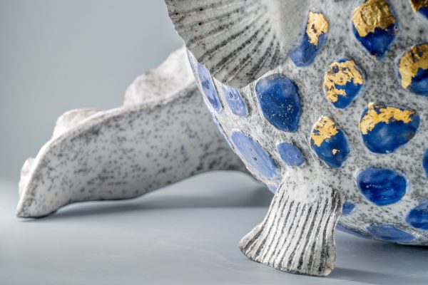 Poisson façonné en céramique Raku, orné de touches de bleu foncé et de feuilles d’or irrégulières, évoque une créature sacrée, imprégnée de mystère et de beauté. Ses formes élégantes et son éclat doré invitent à une contemplation silencieuse, comme un symbole de sérénité et de sagesse éternelle, dimension H 46 cm x L 45 cm x P 48 cm.