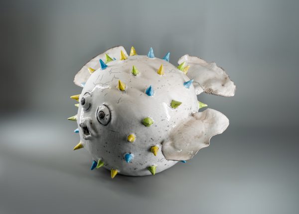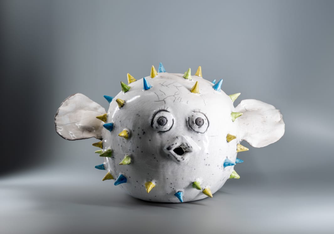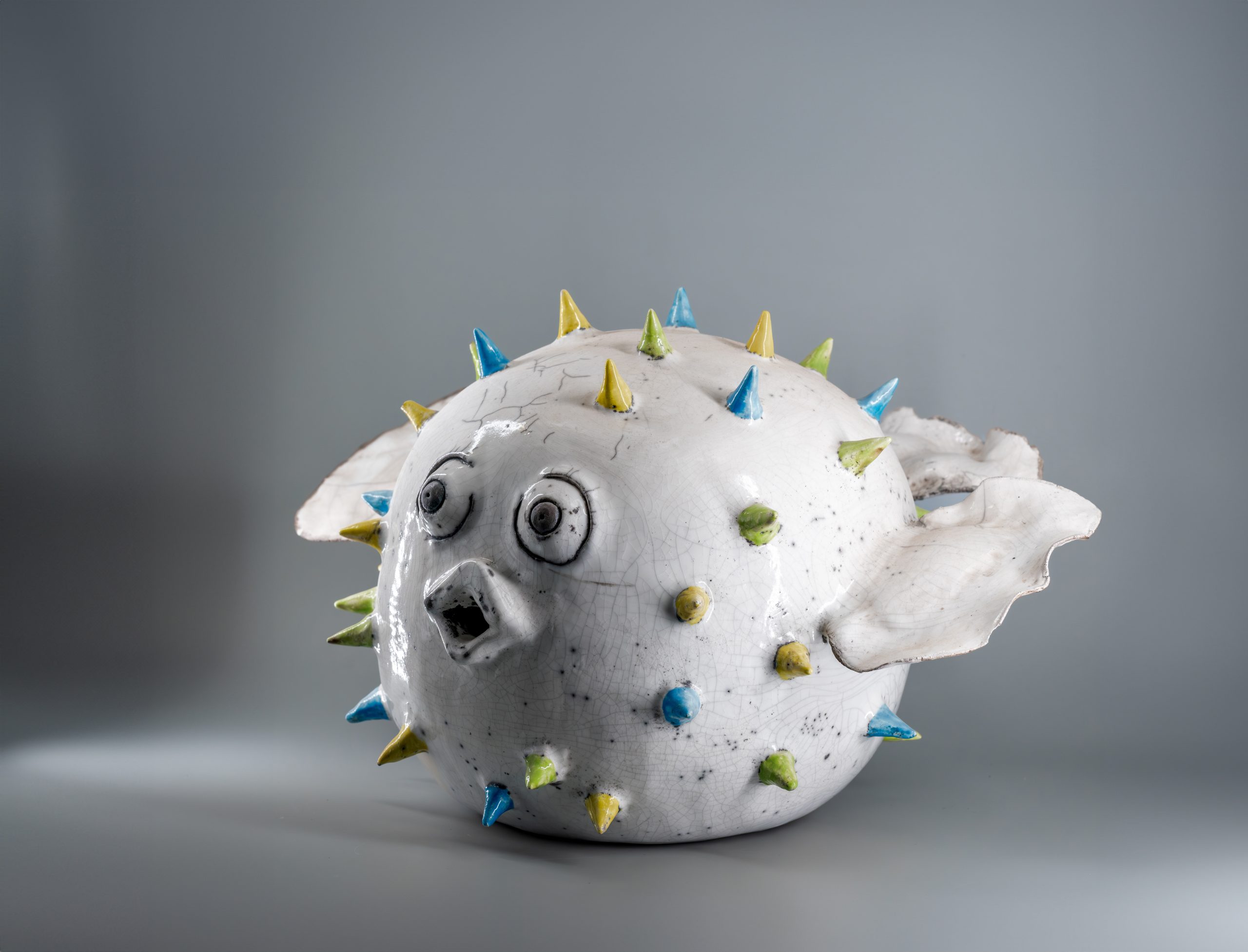 Poisson Fugu en céramique technique Raku se distingue par ses formes arrondies qui évoquent élégamment le mouvement et le dynamisme. Ses piqués colorés, véritables touches d’originalité, apportent un élément de surprise et de caractère, infusant chaque espace d’une ambiance captivante qui évoque la profondeur et la beauté énigmatique des océans, dimension H 45 cm x L 54 cm x P
