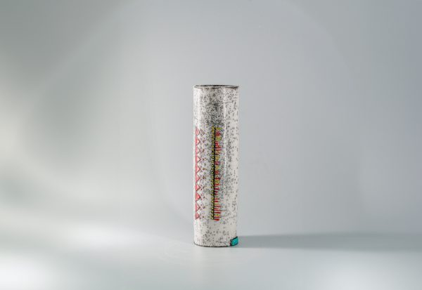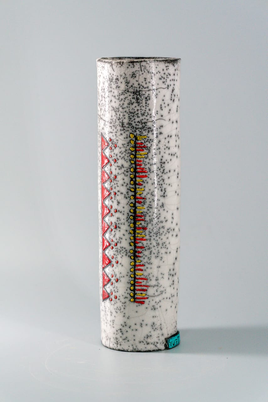 Vase façonné en céramique Raku est décoré d’un graphisme amazigh inspiré du motif traditionnel du « Margoum » , tissé en laine avec un savoir-faire ancestral. Sa forme cylindrique épurée crée un contraste saisissant avec les couleurs éclatantes du motif, évoquant la lumière vibrante et chaleureuse du nord de l’Afrique, et insufflant une atmosphère conviviale et authentique à tout intérieur, dimension H 35 cm x D 10 cm.
