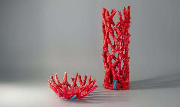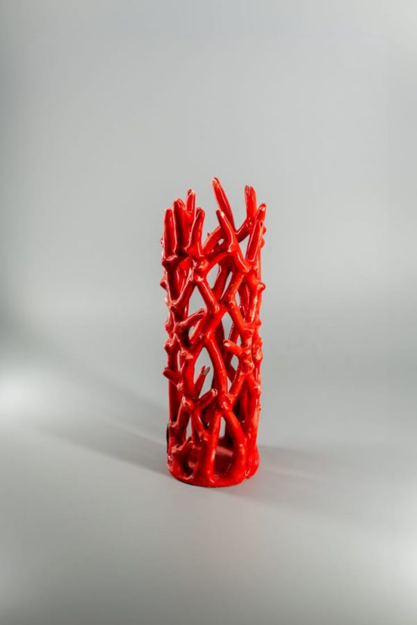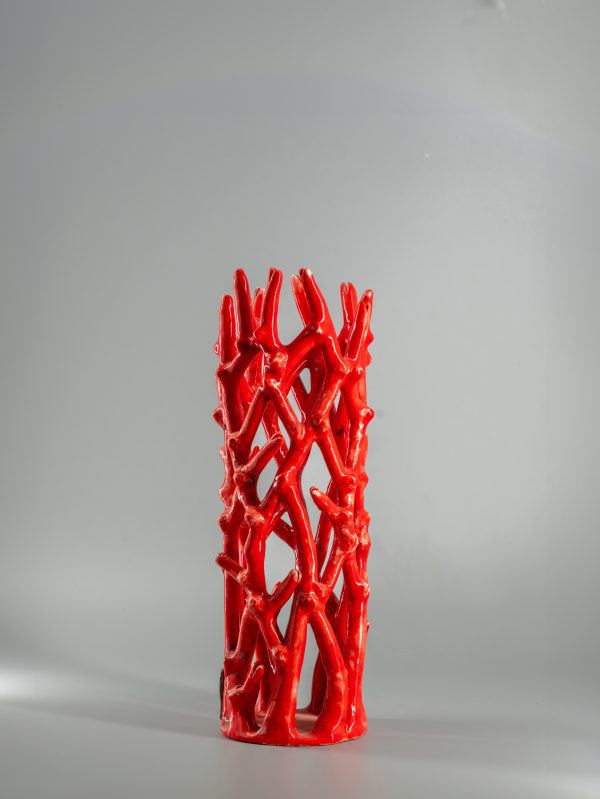 Vase Corail rouge en céramique Raku, avec l’entrelacement délicat de ses branches contrastant avec des nœuds plus affirmés, séduit
